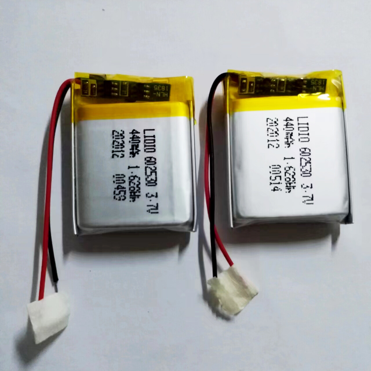A 2-pack of universal 602530 440mAh 3.7V batteries with built-in protection board. Compact size (30x25x6mm) for various electronics.
