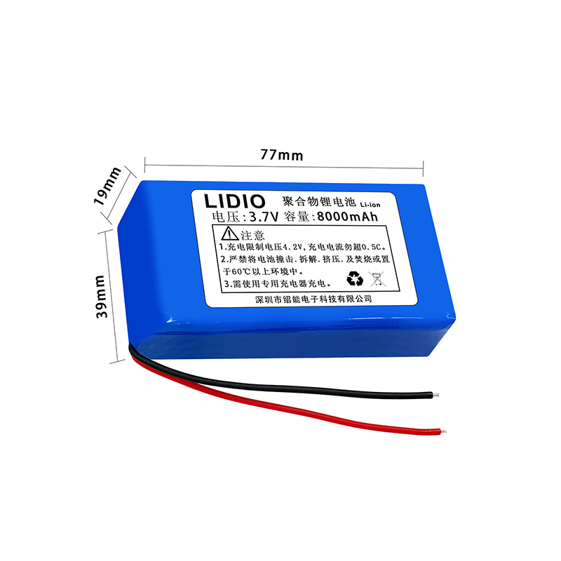 A universal 8000mAh 3.7V Li-ion battery with protection board and wires, measuring 77x39x19mm, for various DIY and electronic projects.