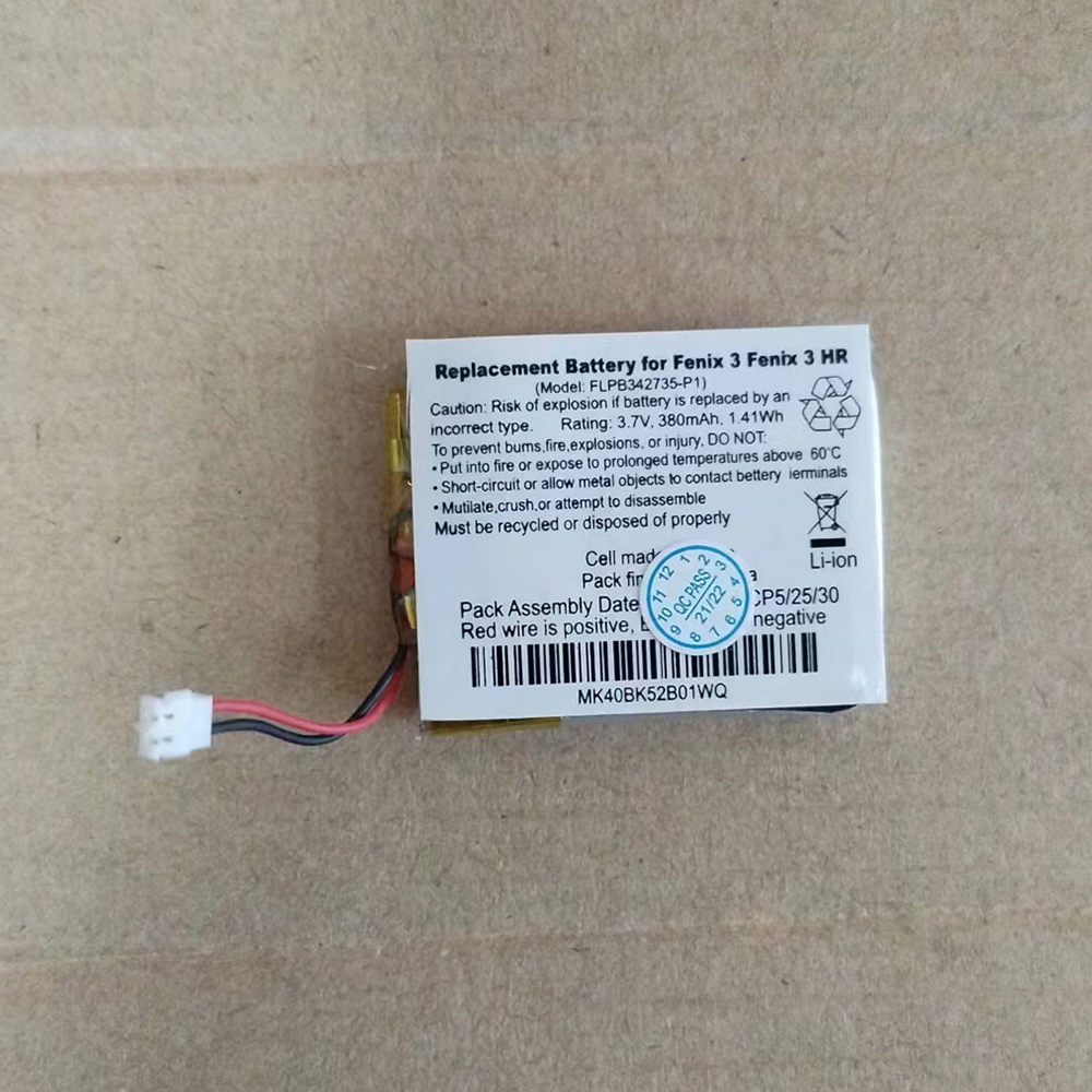 Extend the life of your Garmin Fenix 3 or Fenix 3 HR multisport GPS watch with this FLPB342735-P1 380mAh replacement battery. Designed specifically for these premium adventure watches, this Li-Polymer cell delivers reliable power for tracking your runs, swims, hikes, and heart rate monitoring. Built-in multi-layer safety protection guards against overcharge, over-discharge, and short circuits. Made with grade A cells. CE, RoHS, and UN38.3 certified for safety compliance. Professional installation recommended as the watch battery is not user-replaceable.