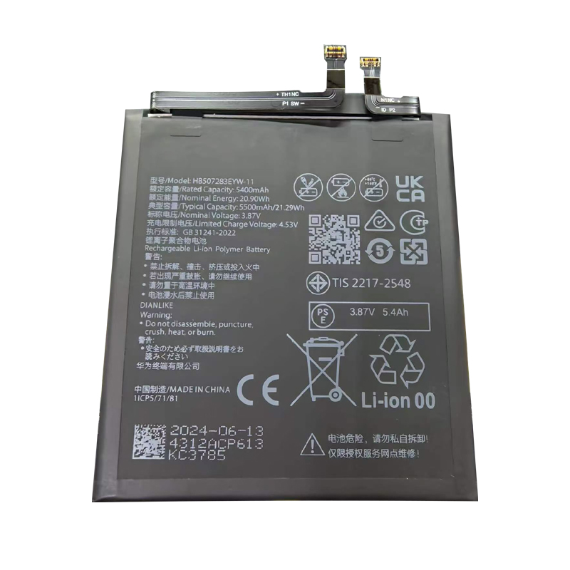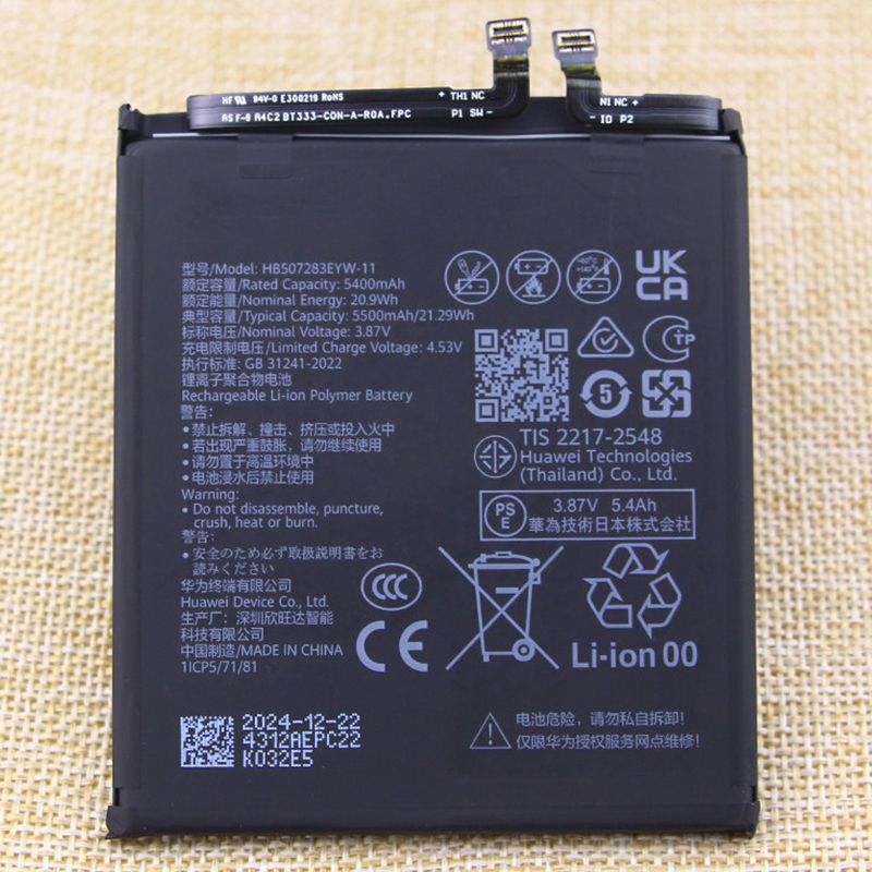 The HB507283EYW-11 battery has a typical capacity of 5500mAh (rated 5400mAh) at 3.87V with a charge limit of 4.45V. The Huawei Mate 70 Pro features a 6.9-inch LTPO OLED display and supports 100W wired SuperCharge and 80W wireless fast charging[citation:2][citation:5]. If you're looking for a high-capacity replacement battery for Huawei Mate 70 Pro to support all-day use, this silicon-carbon Li-Polymer cell is a compatible choice. Made with grade A cells, CE, RoHS, and UN38.3 certified.